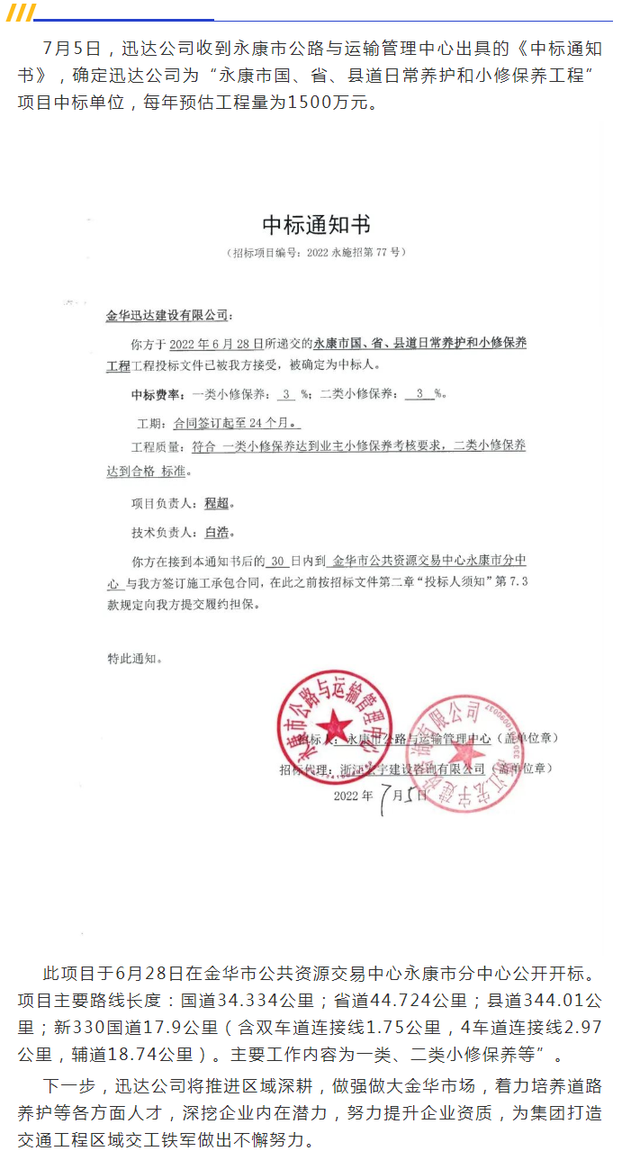 迅達公司中標“永康市國、省、縣道日常養護和小修保養工程”